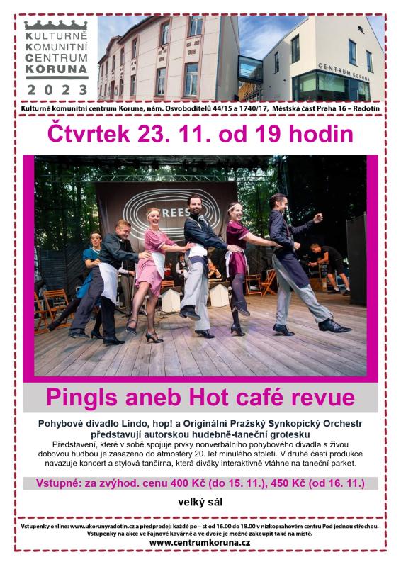 Kulturně komunitní centrum Koruna Vás srdečně zve na pohybové divadlo Lindo, hop! a Originální Praský Synkopický Orchestr, představí autorskou hudebně - taneční grotesku s názvem Pingls aneb Hot café revue. Představení v sobě spojuje prvky nonverbálního pohybového divadla s ivou dobovou hudbou a je zasazeno do atmosféry 20. let minulého století. V druhé části produkce navazuje koncert a stylová tančírna, která diváky interaktivně vtáhne na taneční parket.