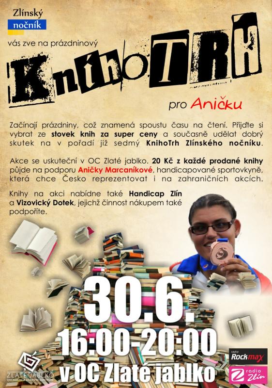 A třetím účelem akce je pomoc vytipovanému jedinci či organizaci, kterému putuje 20 Kč z kadé prodané knihy. Výtěek z prázdninového KnihoTrhu jsme se rozhodli věnovat Aničce Marcaníkové, sportovkyni, která i přes svůj handicap dosahuje výborných výsledků a ráda by reprezentovala Česko i na zahraničních akcích.