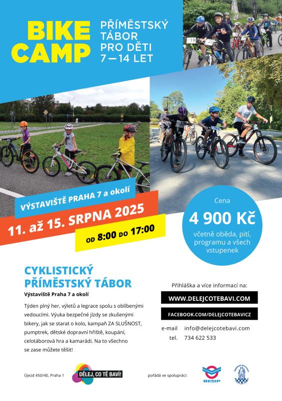Týden plný cyklistiky, výzev a nových přátelství – přesně to čeká účastníky příměstského tábora Bike Camp, který proběhne letos v srpnu v Praze 7. Program je určen dětem od 7 do 14 let a zahrnuje nejen jízdu na kole, ale i hry, soutěe a nácvik bezpečné jízdy v terénu.
